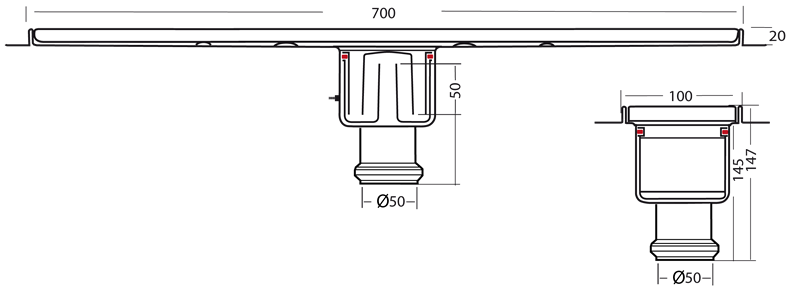 De standaard roestvrijstalen douchegoten met onderuitlaat zijn 100 mm breed en hebben een uitneembare kunststof sifon met een waterslot hoogte van 50 mm. Rondom de goot is een flens aangebracht voor het verantwoord instorten van de goot in de vloer. Alle goten worden geleverd met een afdekfolie zodat er geen cementresten op het roestvrijstalen oppervlak achterblijven.