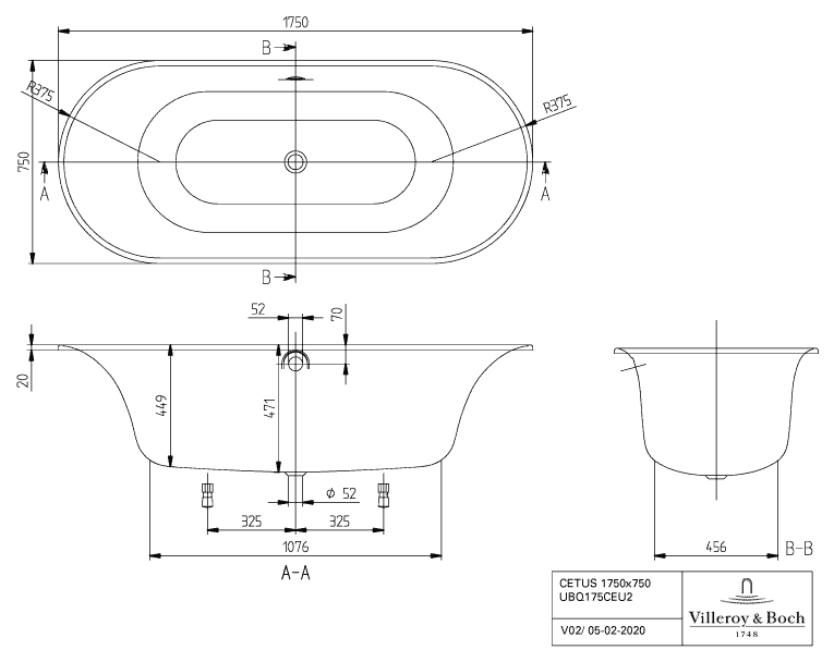 Villeroy & Boch Cetus bad quaryl ovaal 175x75cm met poten wit