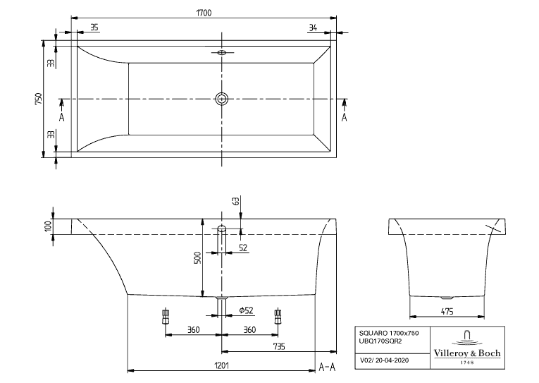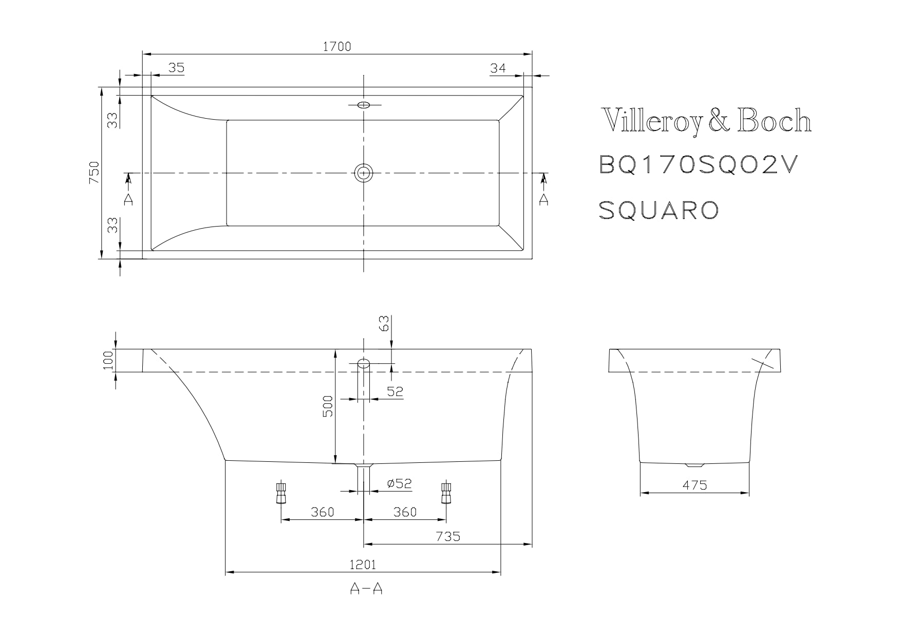 Villeroy & Boch Squaro bad 170x75cm quaryl rechthoekig met poten wit