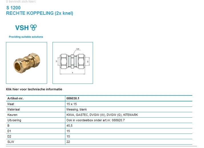 VSH Super Knel Messing knelkoppeling 15mm Gastec / Kiwa