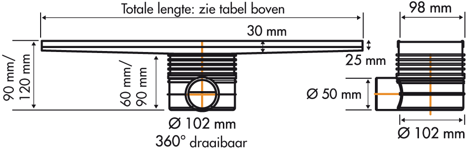 Easy Drain Tegeldrain tegelgoot met zijuitloop 9.8x70cm 50mm RVS
