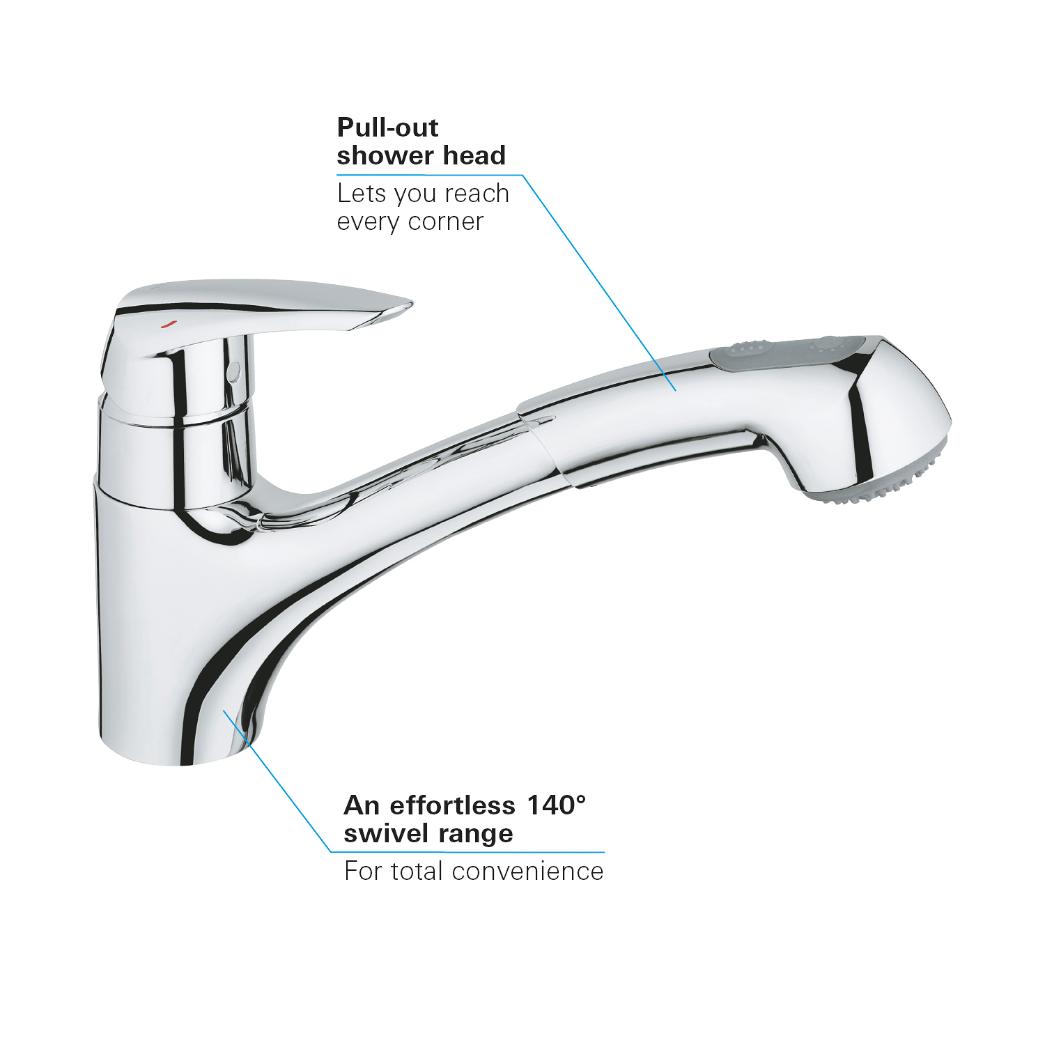 GROHE Eurodisc keukenkraan – de uittrekbare handdouche maakt de kraan jouw praktische hulp in de keuken De Eurodisc keukenmengkraan combineert een elegante, moderne vormgeving met praktische eigenschappen, die in je keuken uitstekend van pas komen. De kraan is afgewerkt met glanzend GROHE StarLight® chroom en is ook verkrijgbaar met GROHE EcoJoy® technologie, waarmee je het waterverbruik kunt beperkten. Je taken in de keuken worden eenvoudig door de draaibare uitloop en de vinvormige greep, die dankzij GROHE SilkMove® technologie met slechts één vinger te bedienen is.