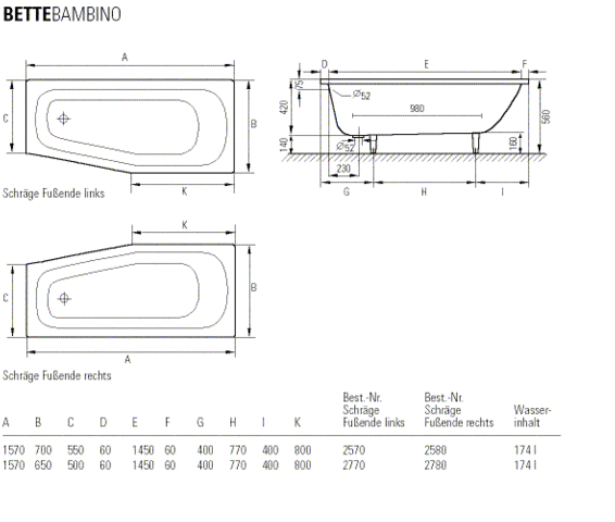 Bette Bambino bad plaatstaal links 157x70/55cm wit
