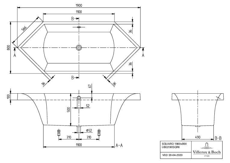 Villeroy & Boch Squaro bad quaryl zeshoekig met poten 190x80x50cm wit