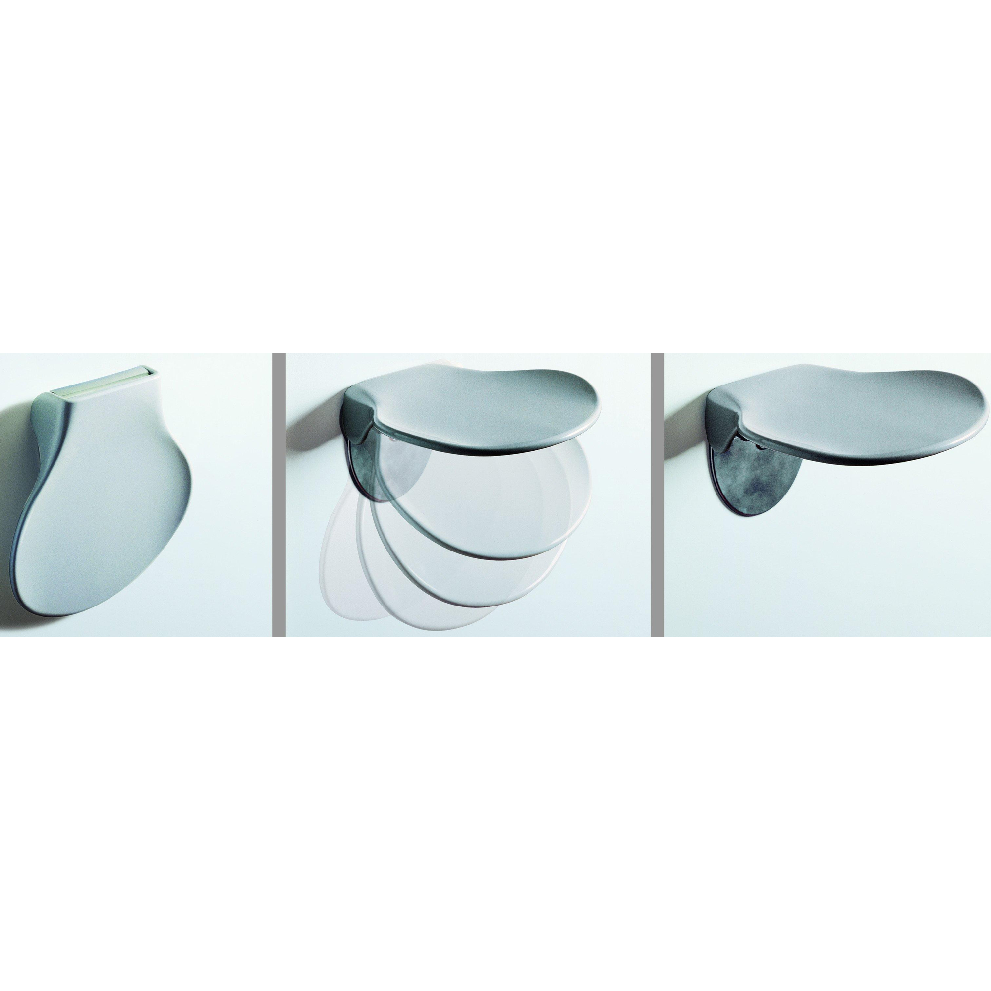 Pressalit klapstoel voor wandmontage, nr. 412, met dempende werking, in door en door gekleurd duroplast, incl. beslag uit roestvrij staal, met veelzijdige toepassingsmogelijkheden, zowel thuis als in bedrijven. Een extra zitplaats voor als het nodig is, discreet maar elegant, die na het gedempte neerklappen langs de wand blijft hangen.