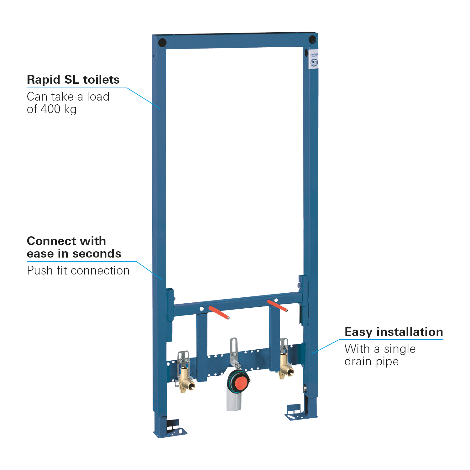 GROHE Rapid SL installatiesysteem – snel en zonder gereedschap je bidet installeren Het Rapid SL systeem geeft je de vrijheid om de ideale badkamer te creëren. Het zorgt voor een veilige en snelle manier om zwevende toiletten, wastafels, wandbidets en urinoirs te installeren. De frames zijn verkrijgbaar in drie verschillende hoogtes. De frames zijn voorgemonteerd, beschikken over bevestigingspunten voor wandclosets en worden streng getest. De frames voor de wandclosets kunnen maximaal 400 kg dragen.