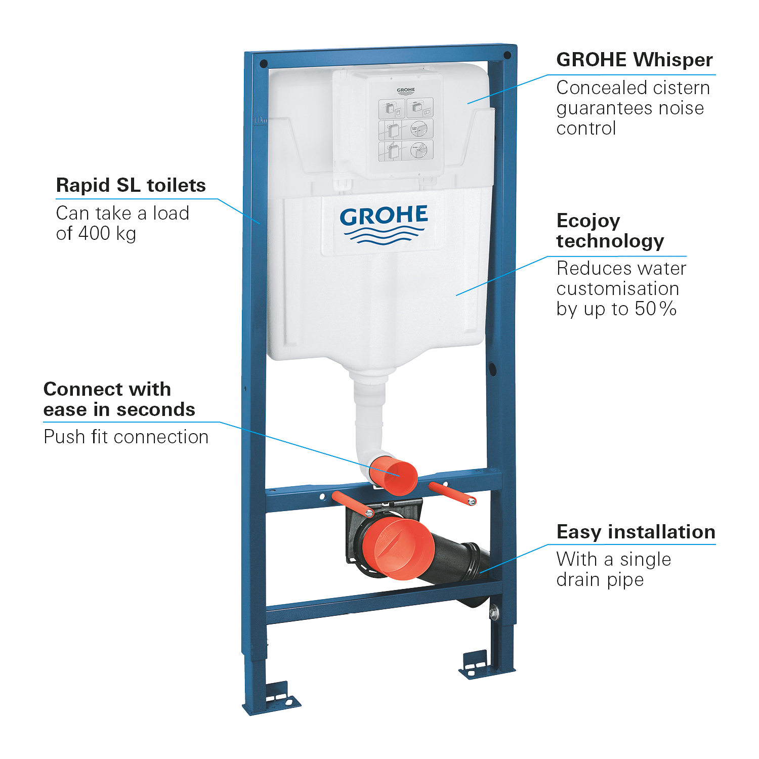 GROHE Rapid SL Installatiesysteem – kortere montagetijd voor een fluisterstille WC Het Rapid SL systeem geeft je de vrijheid om de ideale badkamer te creëren. Het zorgt voor een veilige en snelle manier om zwevende toiletten, wastafels, wandbidets en urinoirs te installeren. De frames zijn verkrijgbaar in drie verschillende hoogtes. De frames zijn voorgemonteerd, beschikken over bevestigingspunten voor wandclosets en worden streng getest. De frames voor de wandclosets kunnen maximaal 400 kg dragen.