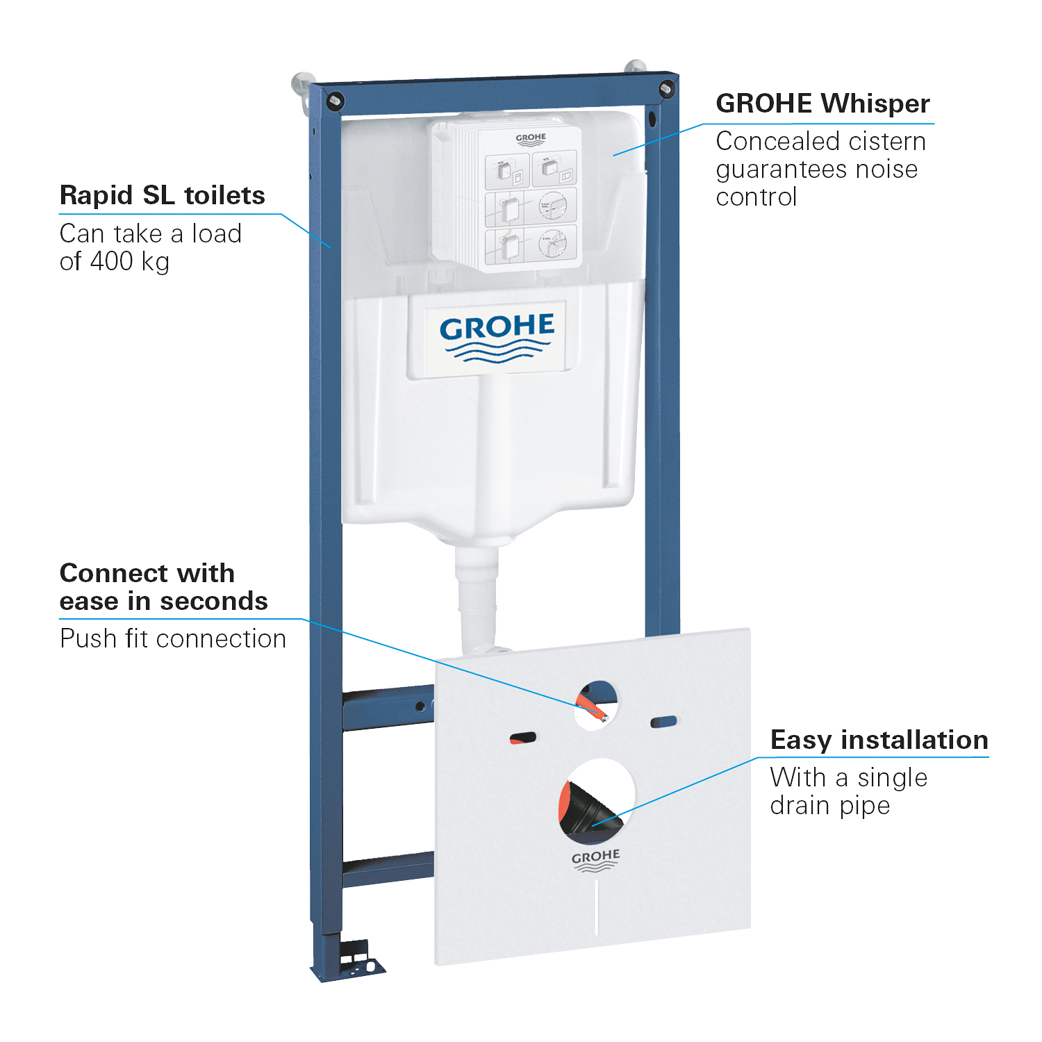 GROHE Rapid SL installatiesysteem – fluisterstil, waterbesparend en extreem belastbaar Het Rapid SL systeem geeft je de vrijheid om de ideale badkamer te creëren. Het zorgt voor een veilige en snelle manier om zwevende toiletten, wastafels, wandbidets en urinoirs te installeren. De frames zijn verkrijgbaar in drie verschillende hoogtes. De frames zijn voorgemonteerd, beschikken over bevestigingspunten voor wandclosets en worden streng getest. De frames voor de wandclosets kunnen maximaal 400 kg dragen.