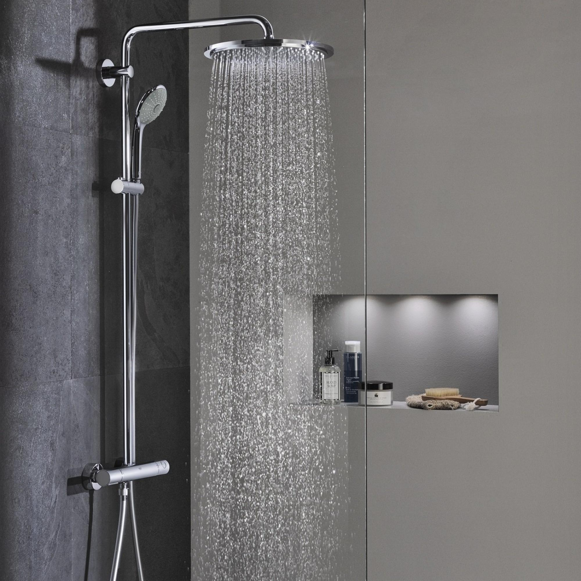 GROHE Euphoria Massage 110 handdouche: de douche met massage-stand De Euphoria doucheserie combineert stijl, kwaliteit en efficiënt gebruik van water. De serie biedt een ruime keuze aan hand- en hoofddouches en een aantal verschillende straalpatronen. Zelfs voor beperkte budgetten zijn deze heerlijke douches betaalbaar. Het ergonomische design van de Euphoria handdouche is voorzien van een extra lange greep die naadloos overgaat in de douchekop met de elegante ring van chroom. GROHE DreamSpray® verdeelt het water gelijkmatig over ieder sproeigaatje voor een ongeëvenaarde douche-ervaring, terwijl de SmartRain straal, die wordt geproduceerd door de SprayDimmer op de handdouche, het waterverbruik met maximaal 40% vermindert. Je hebt keuze uit drie verschillende stijlen douchekoppen ter completering van je douche. De klassieke Euphoria hand- en hoofddouches worden aangevuld door Euphoria Cube, een kleine serie douchekoppen met een elegante vormgeving. De reeks heeft een minimalistisch design met vierkante vormen dat goed past bij onze Cosmopolitan kraanseries.