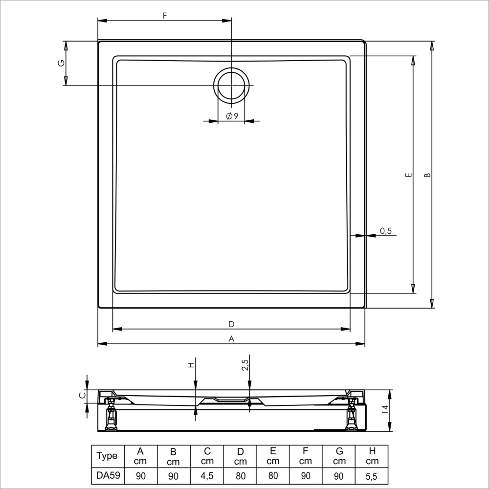 Platte douchebak Davos, op pootset