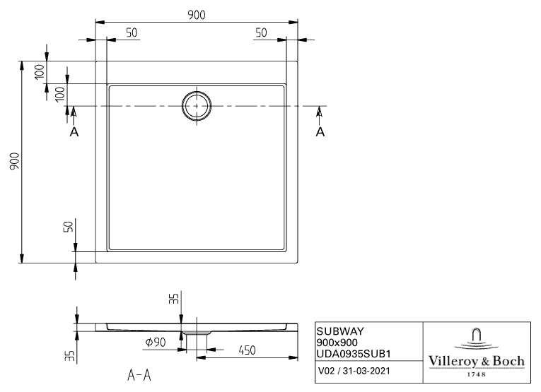 Villeroy & Boch Subway douchebak acryl vierkant 90x90x3,5cm wit