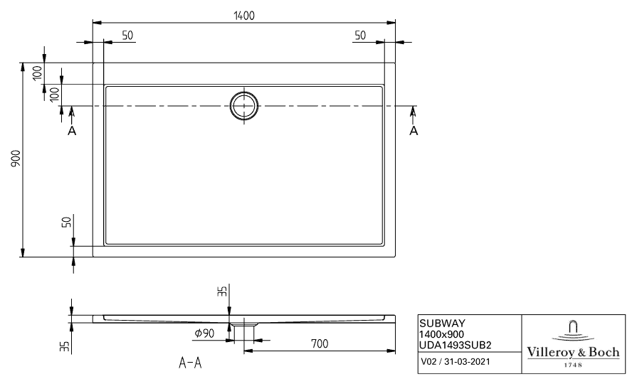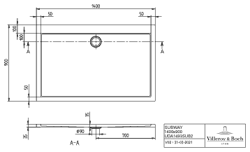 Villeroy & Boch Subway douchebak acryl rechthoekig 140x90x3,5cm wit