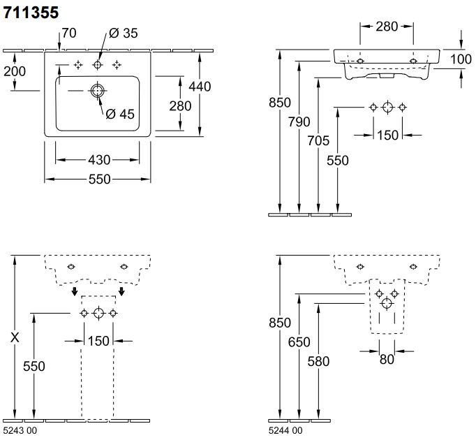Villeroy & Boch Subway 2.0 wastafel 55x47cm 1 kraangat met overloop wit