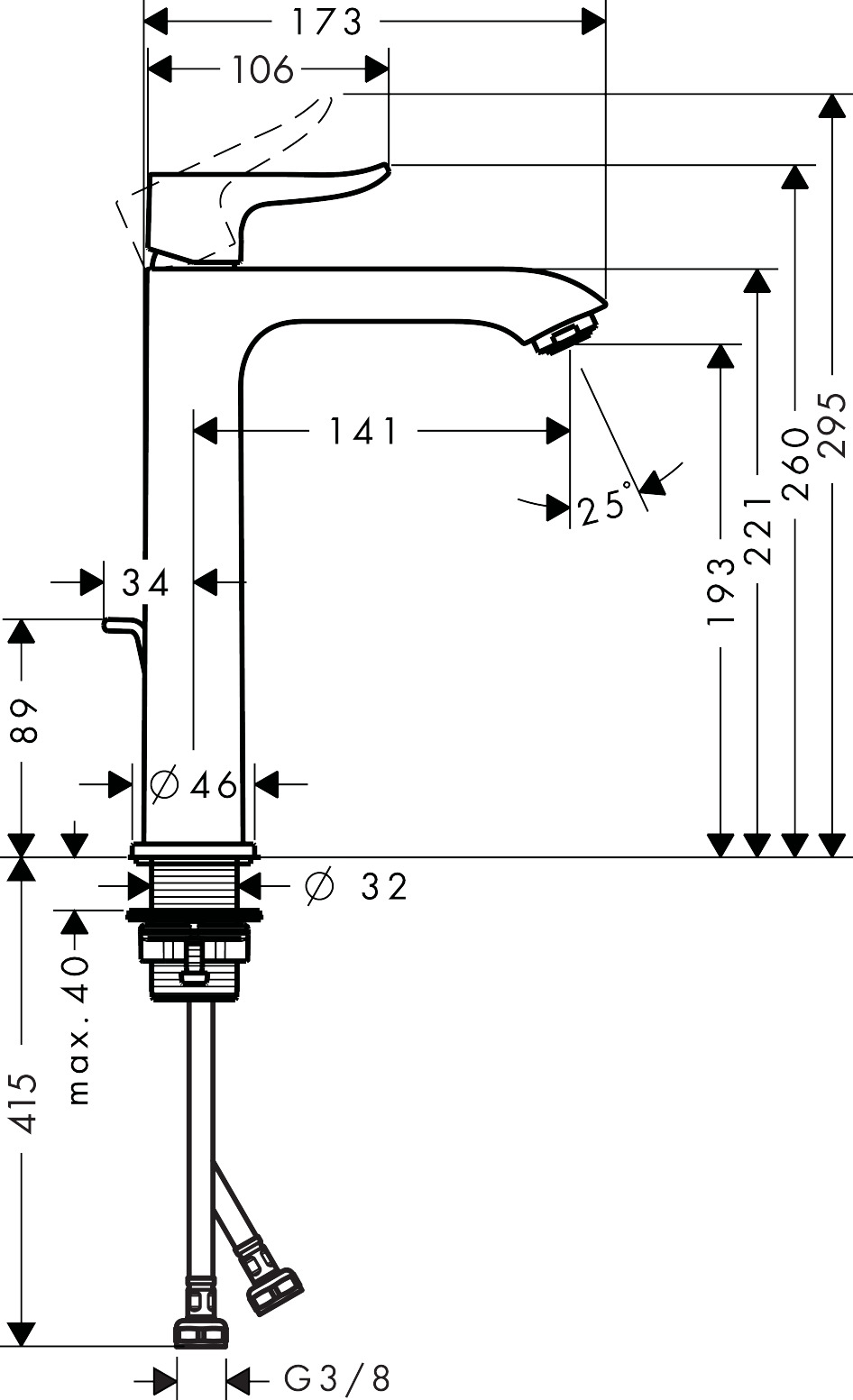 Eéngreeps Highriser wastafelmengkraan 200. Aansluitslangen.