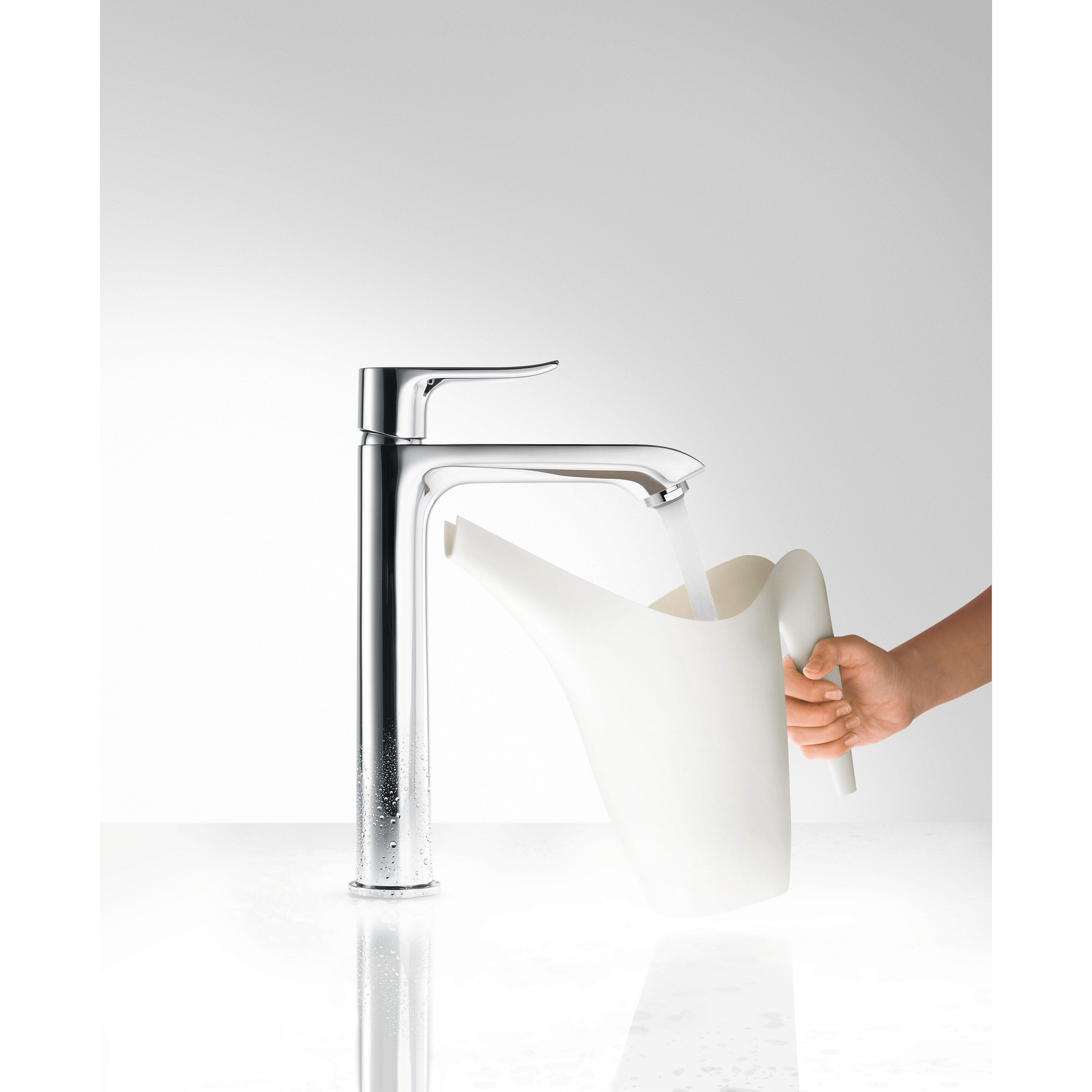 De Metris Eéngreeps Highriser wastafelmengkraan 200 is een trendy mengkraan die geschikt is voor iedere eigentijdse bad- en toiletkamer. Het moderne ontwerp geeft glans aan je wastafel en is een frisse toevoeging aan elk interieur. Je gebruikt de kraan door de hendel met duurzame keramische binnenwerk naar beneden en boven te bewegen. Eéngreeps Highriser wastafelmengkraan 200. Uitloop met voorsprong van 141 mm. Voorzien van een G 1 ¼ afvoergarnituur met een trekstang. Duurzaam keramisch binnenwerk. Normale straalvorming. SafetyFunctie: Met deze functie bepaal je zelf de maximale temperatuur van het water. Hierdoor zal dit nooit te warm worden waardoor extra veiligheid is geboden. EcoSmart: Deze milieubewuste functie bespaart water tot wel 60 procent en laat de kraan niet meer dan vijf liter water per minuut verbruiken. QuickClean antikalksysteem: Een langdurige levensduur is gegarandeerd dankzij dit systeem, waarmee kalk snel wordt weggespoeld. Waterbesparend. Vormt een normale straal. Eenvoudige montage.