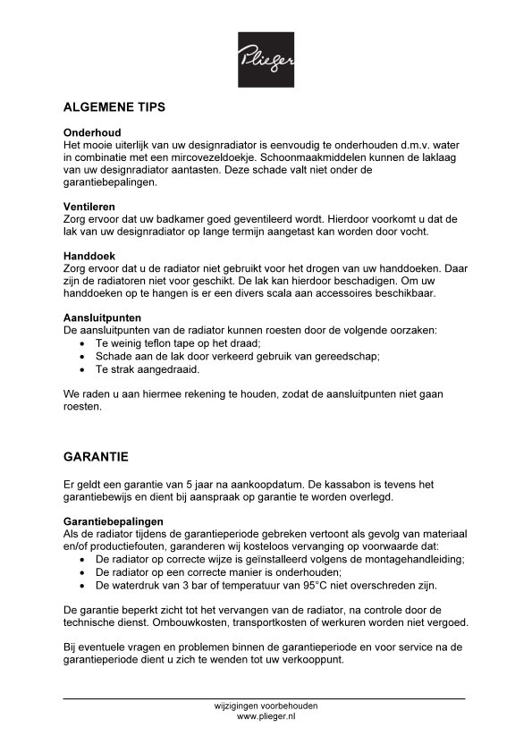 Met Plieger heb je iets goeds in handen. Plieger producten worden met zorg geselecteerd, gemaakt van hoogwaardige materialen en verantwoord geproduceerd. Dit wordt door Plieger nauwgezet gecontroleerd. Daarnaast worden alle Plieger producten in Nederland uitgebreid getest op kwaliteit en montagegemak. Hierdoor garandeert Plieger dat je jarenlang plezier zult hebben van jouw aankoop.