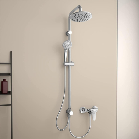 Het **Ideal Standard Idealrain douchesysteem** is de perfecte toevoeging aan jouw badkamer. Dit stijlvolle en functionele douchesysteem is ontworpen voor gebruik met een opbouwkraan of aansluitbocht en biedt een luxe douche-ervaring. Dankzij de combinatie van een royale hoofddouche en een veelzijdige handdouche geniet je van ultiem comfort en gemak.De hoofddouche heeft een diameter van 200 mm en biedt een ontspannende regenstraal. De handdouche met een diameter van 100 mm beschikt over drie straalsoorten: regen, tropische regen en een massagestraal. Zo kies je eenvoudig de waterstraal die het beste bij jouw voorkeur past. De anti-kalk technologie voorkomt kalkaanslag, wat zorgt voor een langere levensduur en eenvoudig onderhoud.