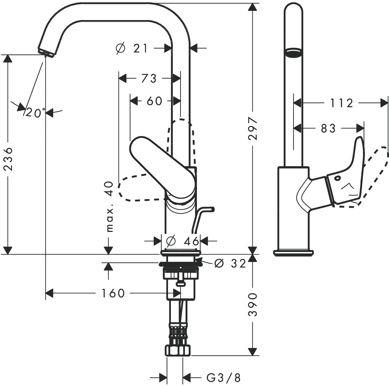 - De uitloop heeft een voorsprong van 160 mm en draaibereik van 120°