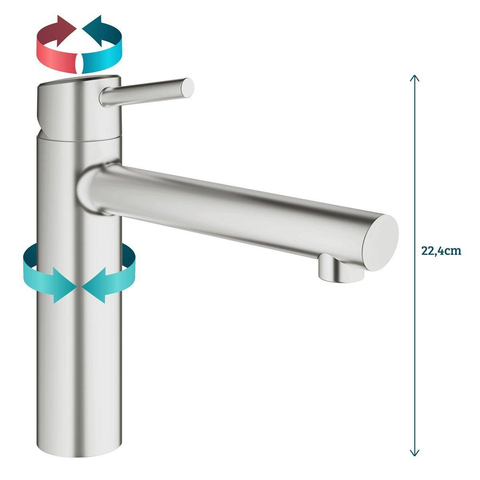 GROHE Concetto keukenkraan: Minimalistisch design met praktisch comfort voor jouw keuken Concetto combineert een chic minimalistisch design met een superieure ergonomische vormgeving; kernwaarden van de Cosmopolitan stijl. De kraan is opgebouwd uit een aantal cilinders en heeft een elegante halfhoge gebogen uitloop. Door de GROHE SilkMove® technologie kun je met één vinger de temperatuur en de waterstroom regelen. En dat alles met een onverslaanbare prijs-kwaliteitverhouding.