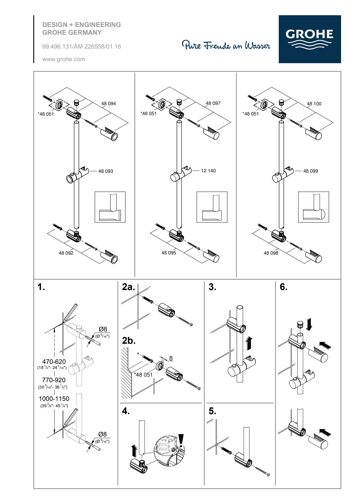 GROHE FastFixation: verstelbare afstand van de bovenste glijstangbevestiging voor montage in bestaande boorgaten