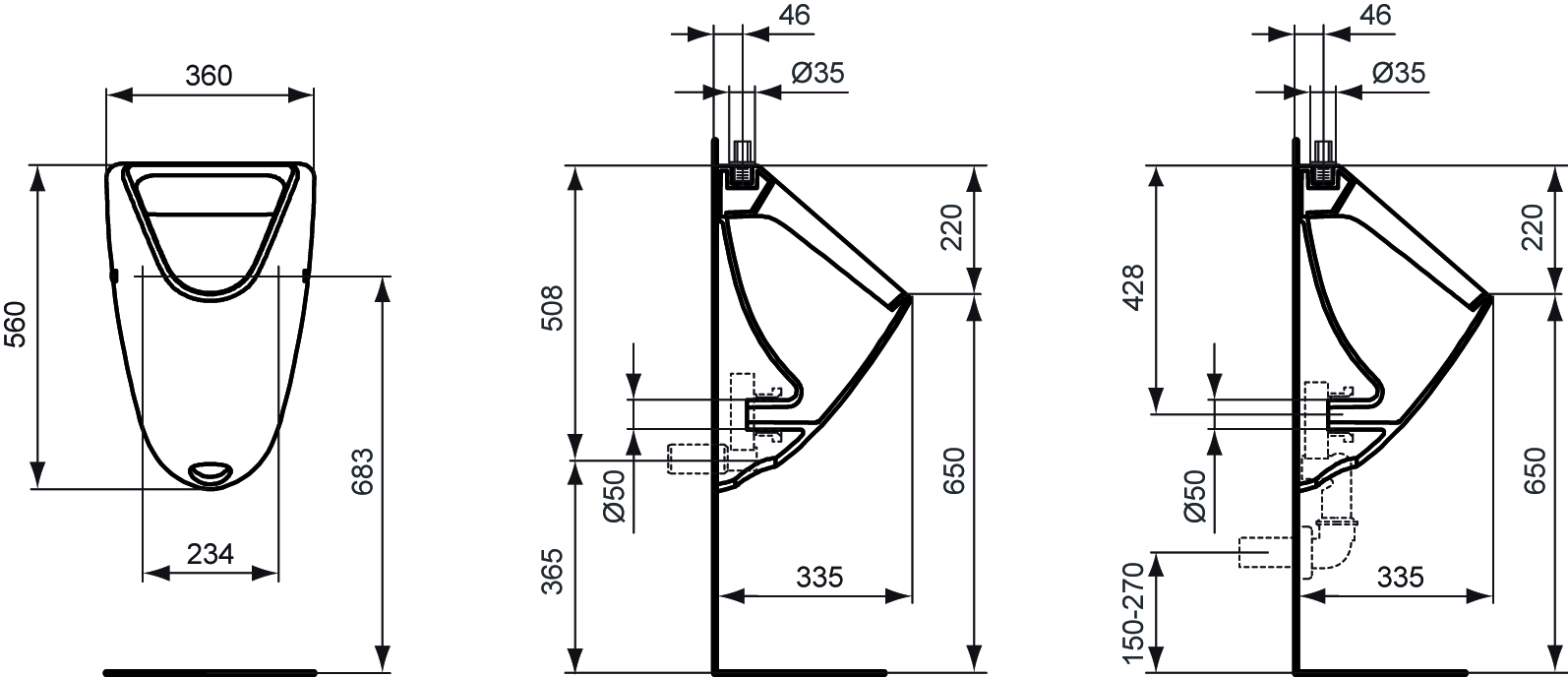 Eurovit urinoir van keramiek. Inclusief bevestigingsset (TT0257919). DIN EN 13407. Toevoer vertikaal van boven en afvoer geïntegreerd of afvoer verticaal naar onder. Voor algemene spoelsystemen. Spoelvolume ca. 0,3 - 0,7 l/sec. Spoelvolume min. 2 l/spoeling.