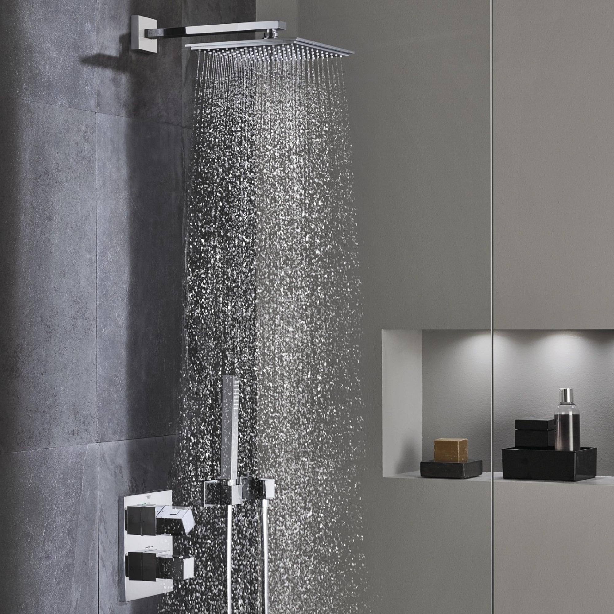 Euphoria Cube+ Stick handdouche - vierkante douche voor bij de badkamer met geometrische vormen De combinatie van vierkante en rechthoekige vormen verrijkt met de laatste GROHE technologieën maakt de Euphoria Cube een slimme keuze als je houdt van minimalistisch design in je badkamer. De minimale lijnen en moderne esthetiek van de handdouche komen terug in de heldere vierkante outline van de hoofddouche in deze ingetogen collectie die pure geometrische vormen in je doucheomgeving brengt. Om van de verkwikkende Rain straal te kunnen genieten, is de Euphoria Cube uitgerust met de GROHE DreamSpray® technologie. De Euphoria Cube+ handdouche is volledig van metaal. De serie heeft een minimalistisch design met vierkante vormen dat goed past bij onze Cosmopolitan kraanseries. Het vierkante design is doorgevoerd tot aan de wandhouder.