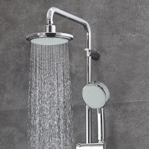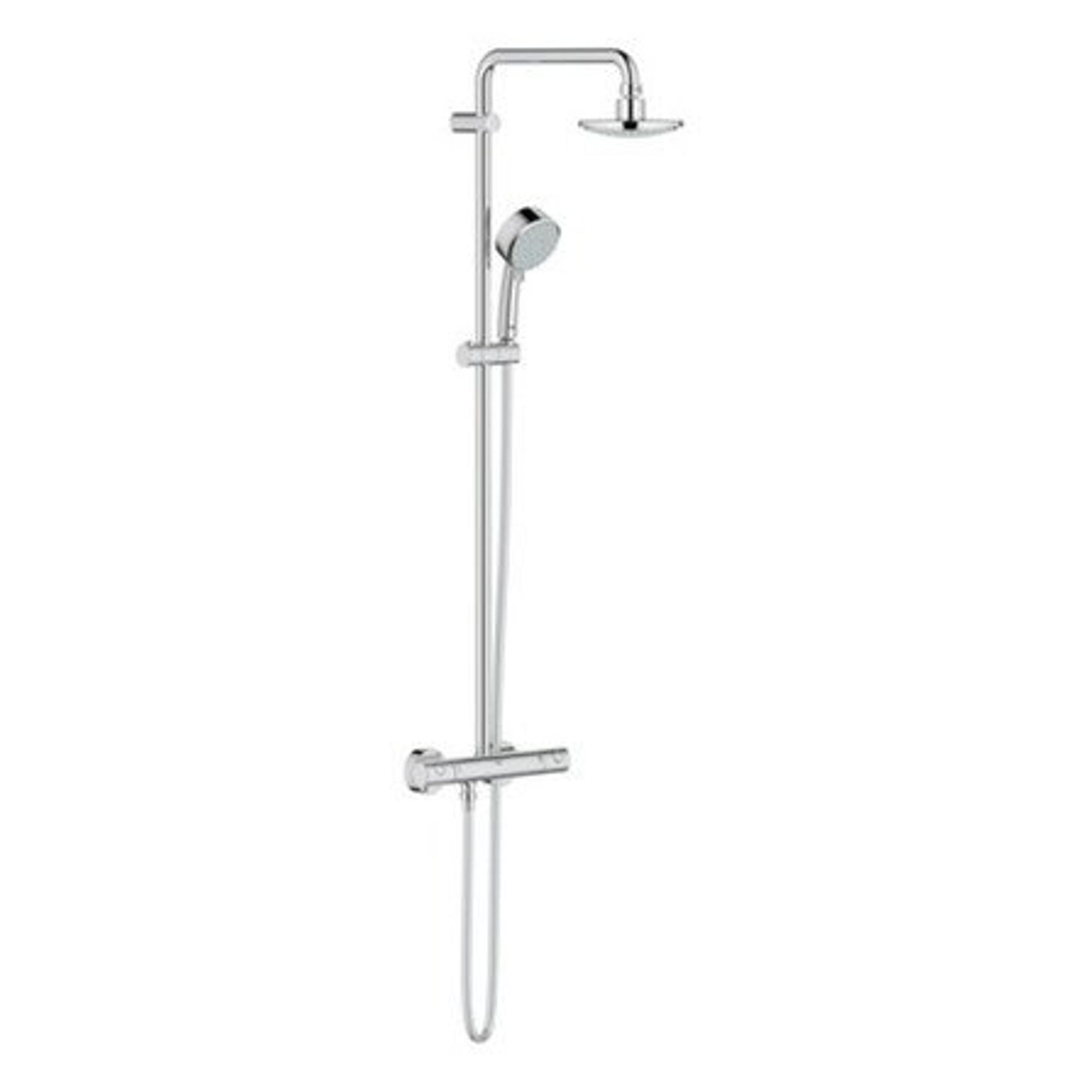 GROHE Tempesta New Cosmopolitan 160 douchesysteem – voor een heerlijk verfrissende douchebeurt Dit zeer aantrekkelijk geprijsde New Tempesta Cosmopolitan douchesysteem is de perfecte keuze voor de moderne badkamer. Zoals alle GROHE douchesystemen is hij eenvoudig te installeren en voorzien van de beste technologieën. De hoofddouche van 160 mm is kantelbaar en de handdouches bevat twee straalsoorten, inclusief de met lucht geïnjecteerde straalsoort GROHE Rain O². GROHE DreamSpray® zorgt voor een perfecte waterverdeling over alle sproeigaatjes. Met GROHE TurboStat® technologie wordt snel en continu de gewenste temperatuur bereikt.