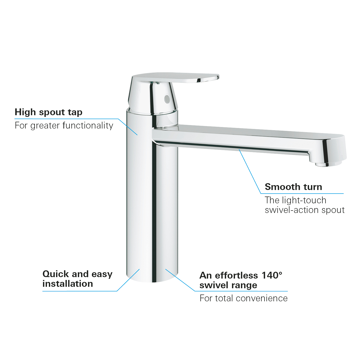 GROHE Eurosmart Cosmopolitan – De moderne keukenkraan met mediumhoge uitloop Kiezen voor de stijl van de Eurosmart Cosmopolitan is kiezen voor modern design, voor gebruiksgemak en hoge kwaliteit. De strakke lijnen van kraan en hendel ogen elegant en de GROHE SilkMove®- en GROHE StarLight®-techniek garanderen een lichte bediening en een langdurige glans. Maar ontdek de GROHE Eurosmart Cosmopolitan-serie vooral zelf. Hier gaan design, kwaliteit en een aantrekkelijke prijs werkelijk hand in hand.
