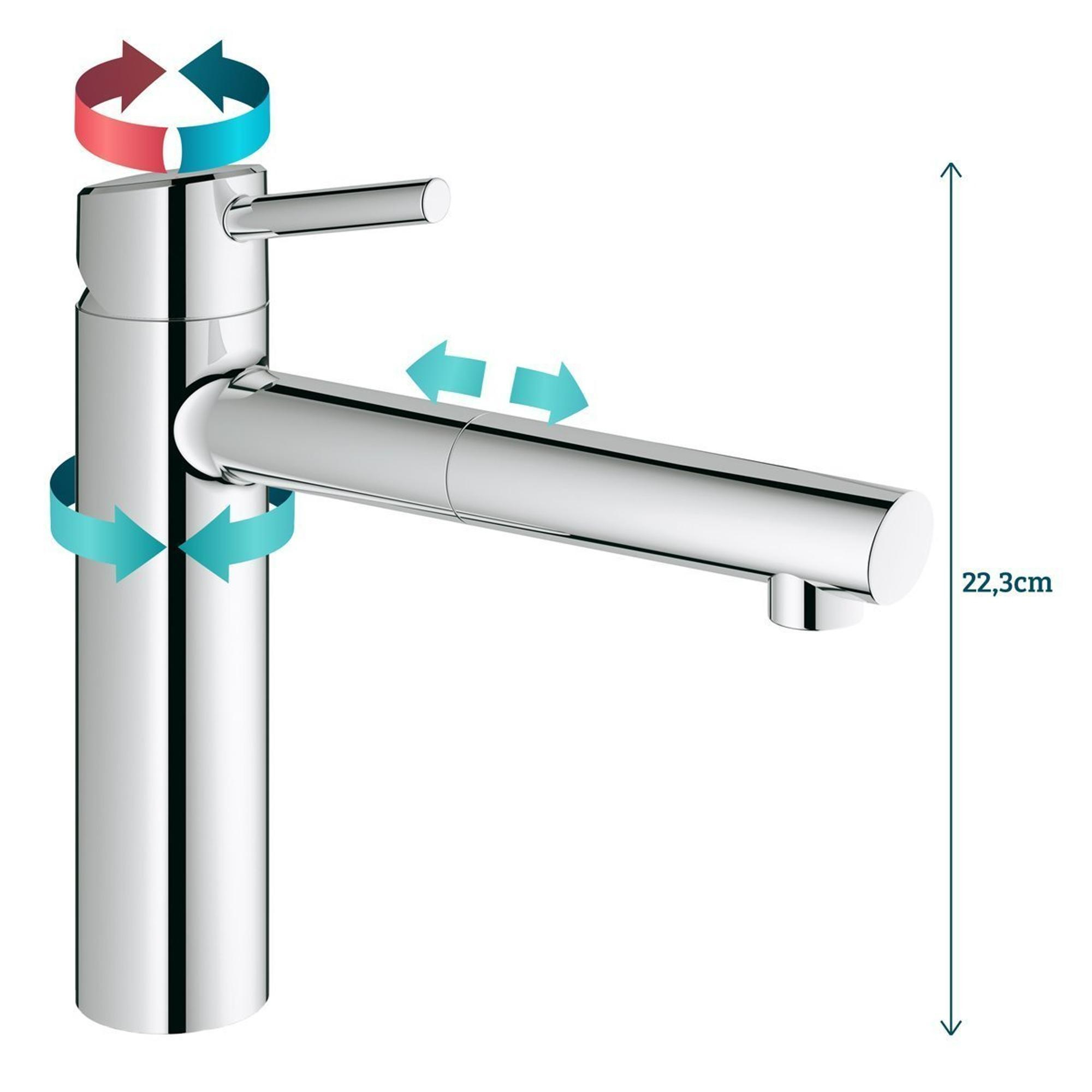 GROHE Concetto keukenkraan: Vergroot je werkterrein met de uittrekbare handdouche! Concetto combineert een chic minimalistisch design met een superieure ergonomische vormgeving; kernwaarden van de Cosmopolitan stijl. De kraan is opgebouwd uit een aantal cilinders en heeft een elegante halfhoge gebogen uitloop. Door de GROHE SilkMove® technologie kun je met één vinger de temperatuur en de waterstroom regelen. En dat alles met een onverslaanbare prijs-kwaliteitverhouding.