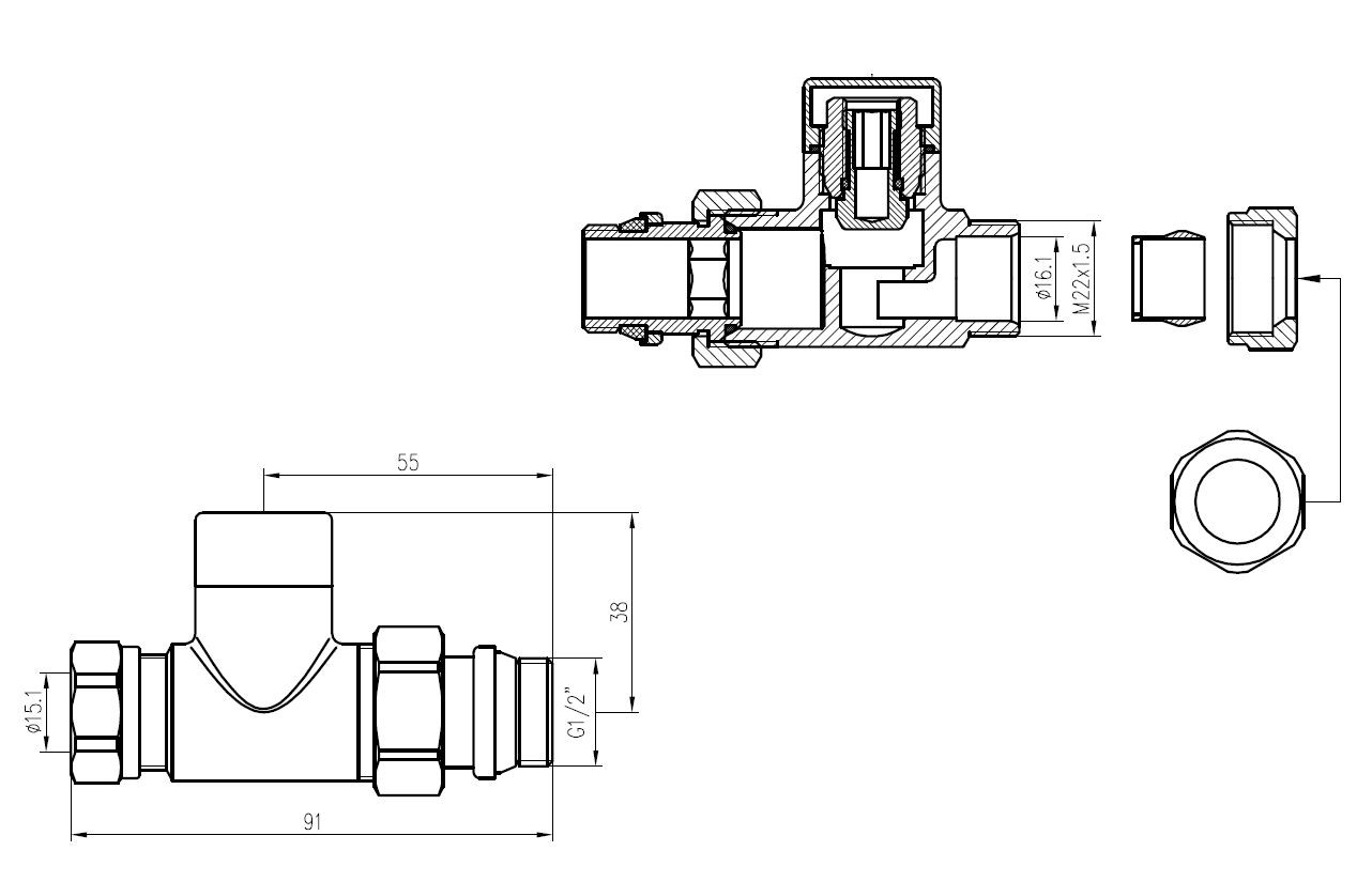 Riko luxe regeltee 1/2''x15 (M22) knel recht chroom