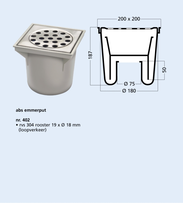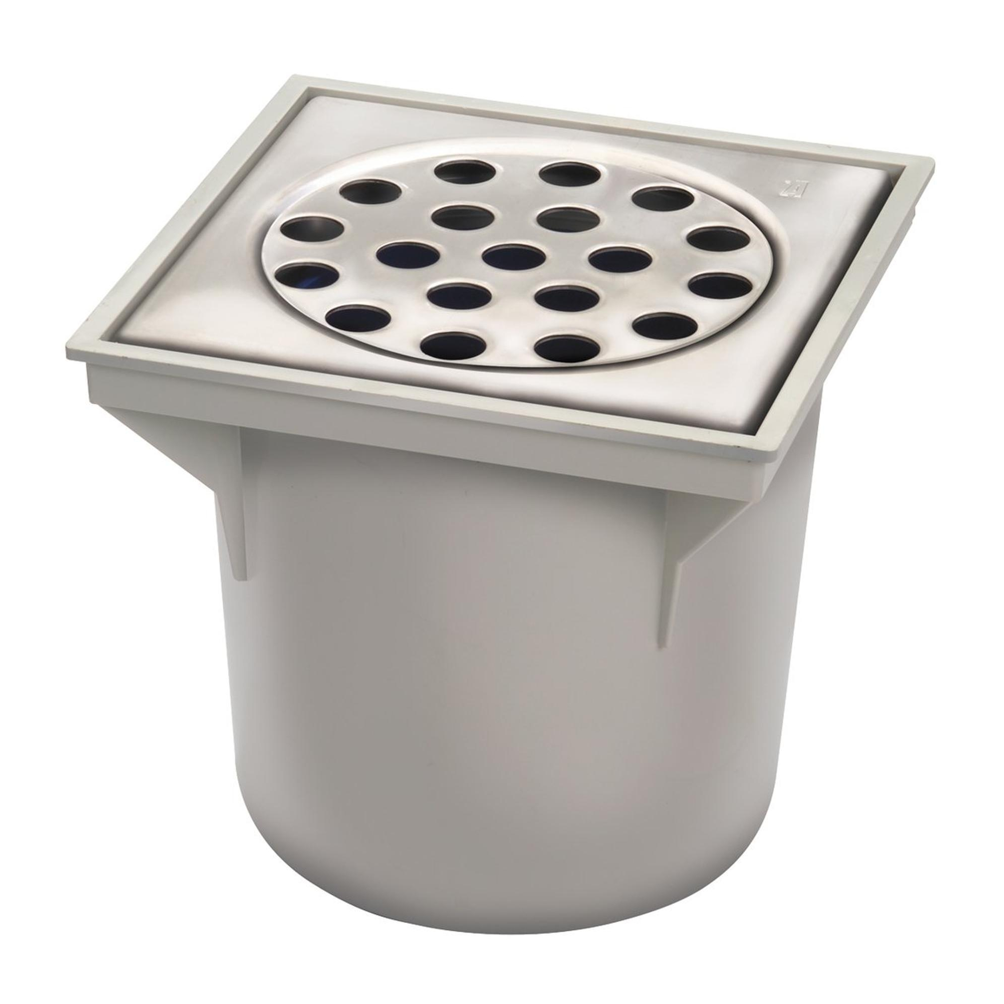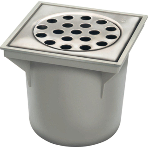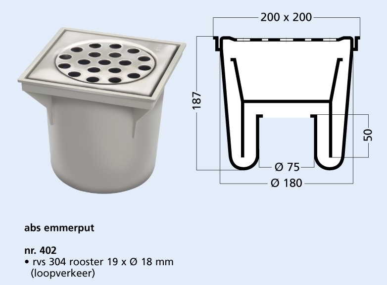 De vloerput is vervaardigd uit hoogwaardig ABS kunststof, wat een gladde structuur biedt en uitstekend bestand is tegen slijtage. Het RVS rooster is 2 mm dik en voorzien van 19 gaten van Ø18 mm, wat zorgt voor een efficiënte afvoer van water. De vloerput heeft een afvoercapaciteit van 1 liter per seconde en is belastbaar tot 250 kg.