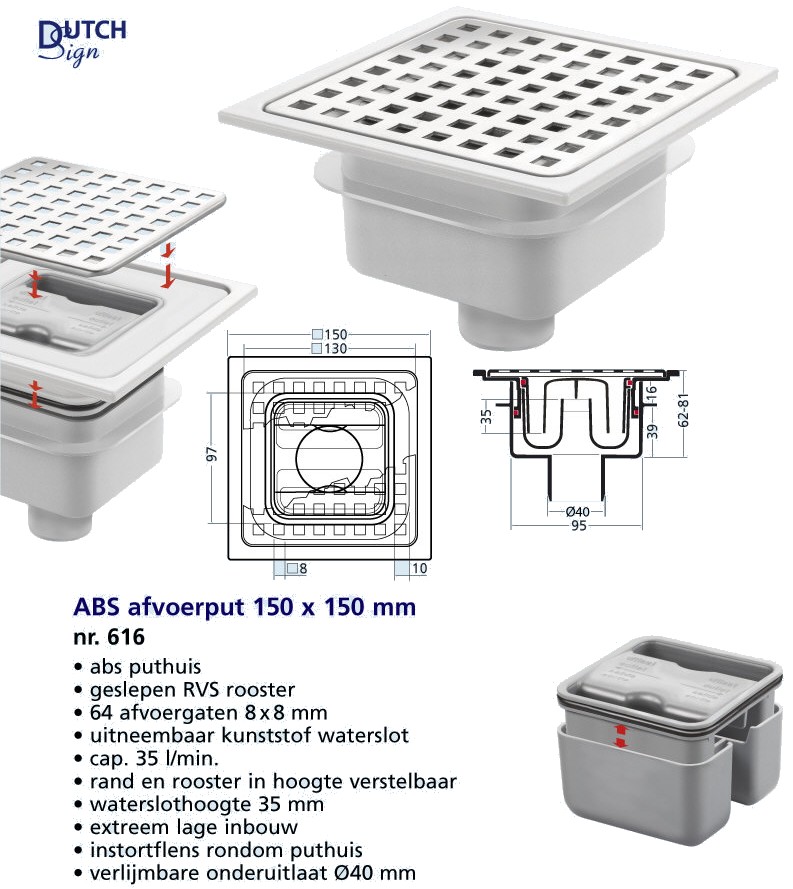 Van Den Berg abs vloerput met rvs rooster 15x15 o uitlaat 40mm