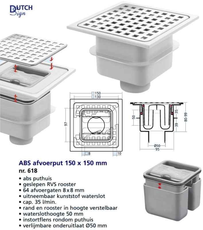 Van Den Berg abs vloerput met rvs rooster 15x15 o uitlaat 50mm