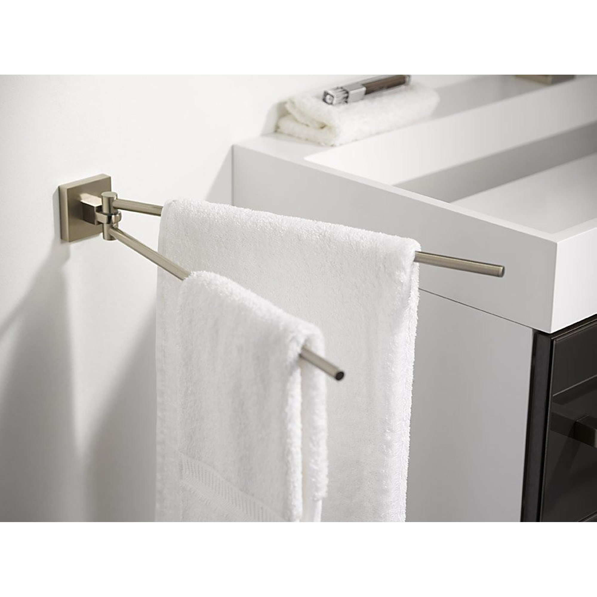 Bij deze handdoekhouder gaan rond en vierkant evenwichtig samen. Een draaibare handdoekhouder neemt nauwelijks ruimte in beslag, maar u kunt er wel twee handdoeken op kwijt. Ideaal naast uw badkamermeubel. De stangen kunnen draaien: tot 180 graden en los van elkaar.