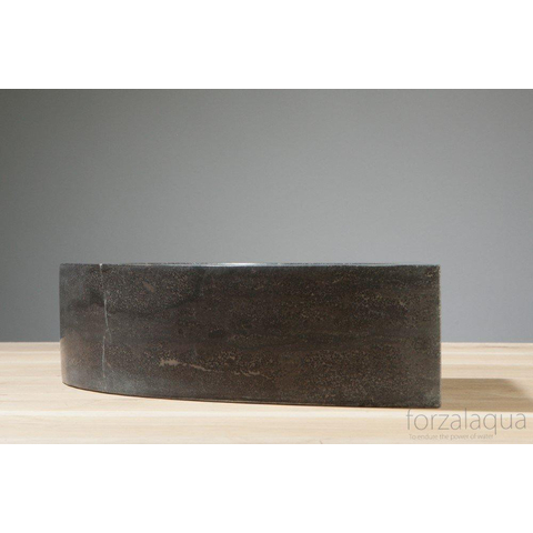 Forzalaqua selecteert haar grondstoffen zelf en werkt met natuursteen afkomstig uit ’s werelds oudste steengroeves. Daar vindt je o.a. mooie kwaliteiten graniet, travertin en marmer. Grote massieve blokken natuursteen worden gewonnen en getransporteerd naar de werkplaatsen. Natuursteenbewerkers bewerken de blokken handmatig tot een van de unieke modellen van Forzalaqua. De rand bij dit model is gefrijnd met een bijtel en hamer. Zo worden er groeven geproduceerd die een ruwe en exclusieve uitstraling geven.