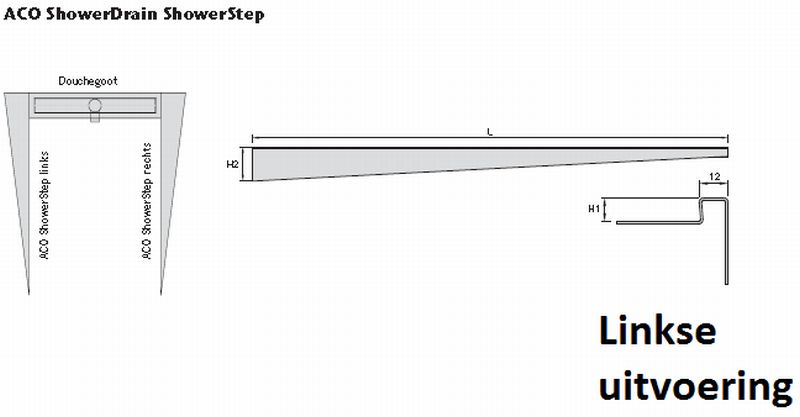 De badkamervloer loopt vlak (geen afschot) maar voor een goede afwatering van een inloopdouche is een afschot van 1,5 tot 2% nodig. Dit heeft tot gevolg dat er een steeds groter hoogteverschil ontstaat tussen de douchevloer en de vloer van de inloopdouche. De ACO ShowerStep is een RVS-profiel dat zorgt voor een fraaie en schone overgang bij dit niveau- verschil, zodat de zijkant van de tegel of dekvloer niet meer zichtbaar is.