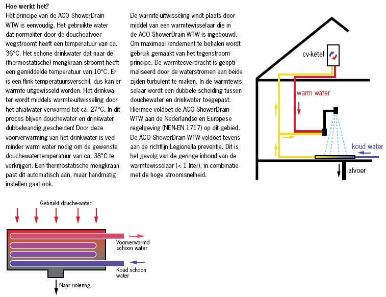 Het principe van de ACO ShowerDrain X is eenvoudig. Het gebruikte water dat normaliter door de doucheafvoer wegstroomt heeft een temperatuur van ca. 36°C. Het schone kraanwater dat naar de (thermostatische) mengkraan stroomt heeft een gemiddelde temperatuur van 10°C. Er is een flink temperatuursverschil, dus kan er warmte uitgewisseld worden. Het kraanwater wordt middels warmte-uitwisseling door het afvalwater verwarmd tot ca. 27°C. In dit proces blijven douchewater en kraanwater dubbelwandig gescheiden! Door deze voorverwarming van het kraanwater is veel minder warm water nodig om de gewenste douchewatertemperatuur van ca. 38°C te verkrijgen. Hiermee voldoet de ACO ShowerDrain Xaan de Nederlandse en Europese regelgeving (NEN-EN 1717) op dit gebied. De ACO ShowerDrain X voldoet tevens aan de richtlijn Legionella preventie.