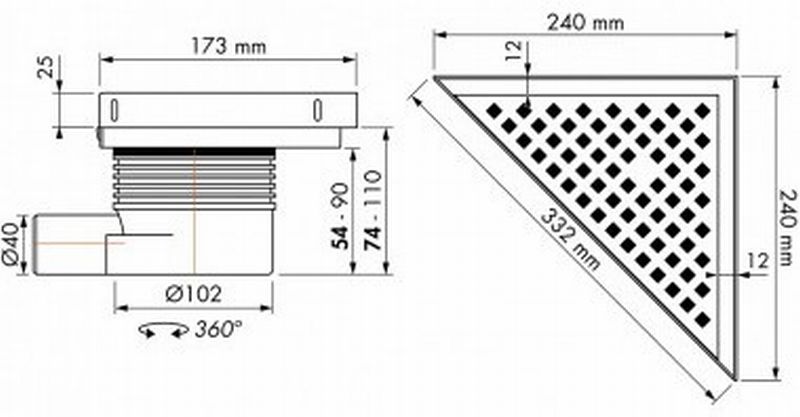Easy drain Aqua plus delta vloerput - driehoek - 2.4x3.3cm - afwerkdeel - rooster - flens - zijuitlaat - 24x24cm - inbouwdiepte 7.4cm - RVS