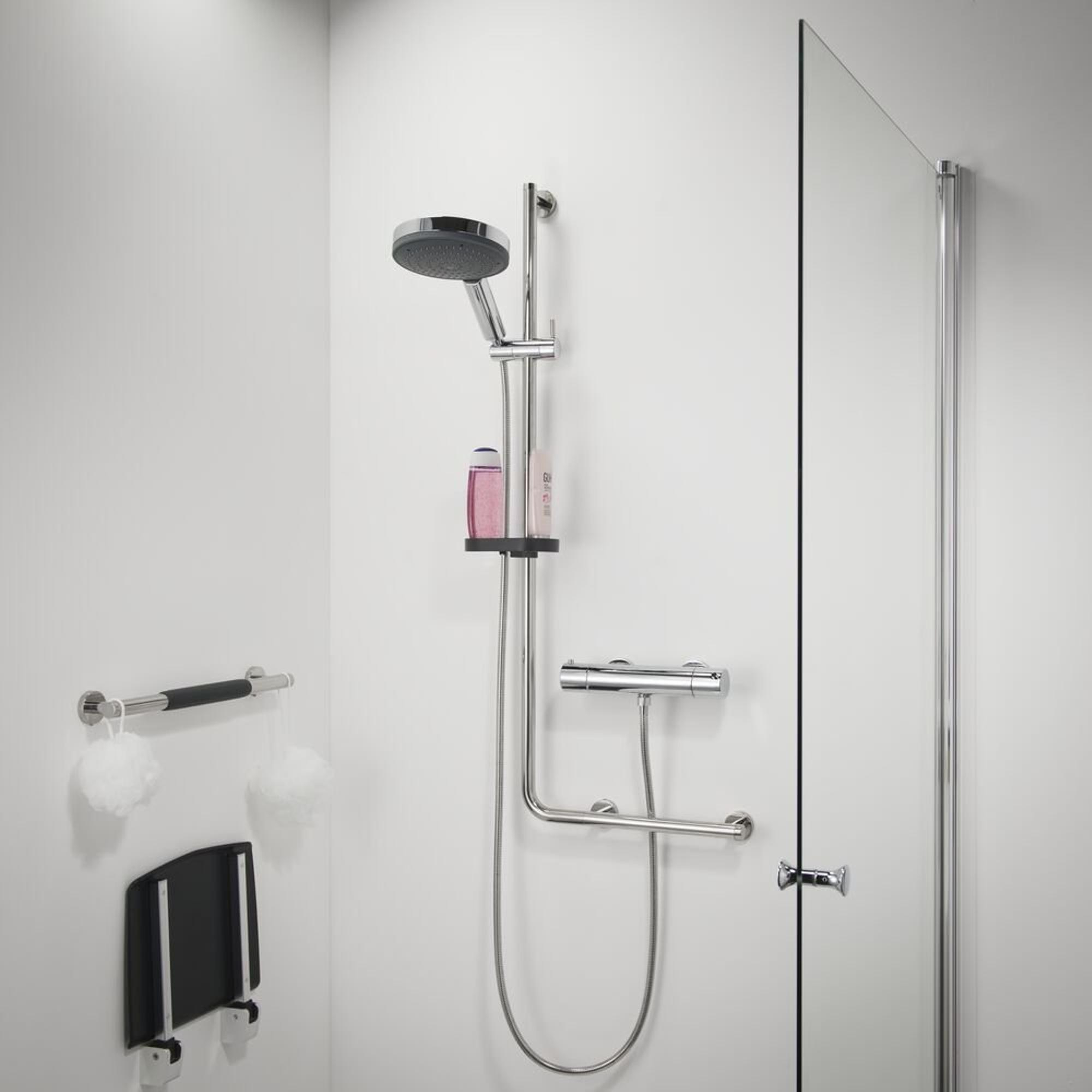 Het opklapbare douchezitje uit de Tiger Boston Comfort & Safety serie is uitgevoerd in de kleur donkergrijs en biedt extra ondersteuning en comfort tijdens het douchen. Het zitje kan eenvoudig omhoog geklapt worden wanneer deze niet wordt gebruikt en de maximale belastbaarheid bedraagt 120 kg.