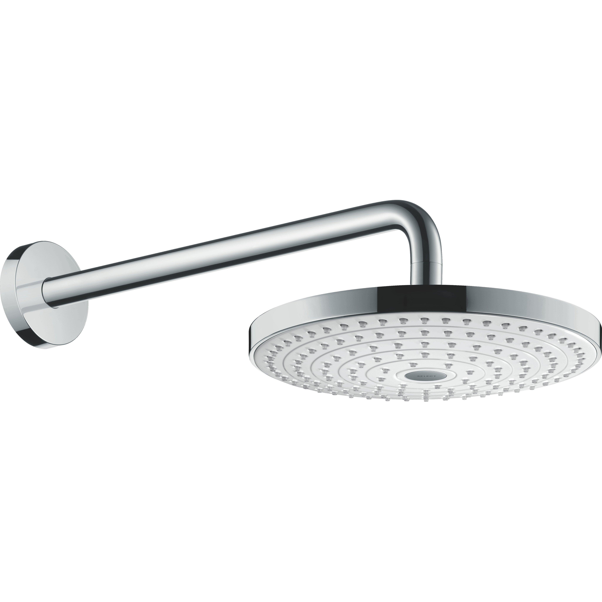 De beide straalsoorten worden met de Select-knop van hansgrohe direct aan de douchekop omgeschakeld (Select). Zo is er afhankelijk van de stemming altijd de juiste douchestraal. De meegeleverde douchearm voor wandaansluiting (390 mm) brengt de regendouche daarbij in de ideale positie. Want door het kogelgewricht is de hoofddouche ook in een hoek draaibaar