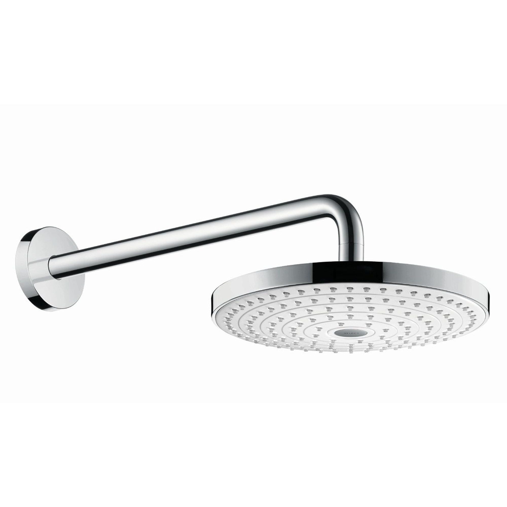 Afgerond geheel: grote regendouche met twee straalsoorten, douchearm voor wandaansluiting inbegrepen
