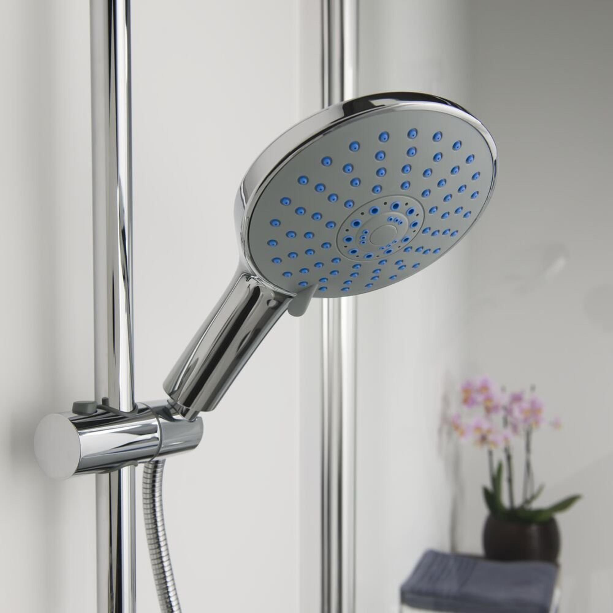 De ruime ronde handdouche heeft een doorsnede van 15 cm waardoor je altijd comfortabel onder de warme douche staat. De waterstraal is te regelen in 6 verschillende standen naar voorkeur: bruisend, massage, vol, regen of een combinatie daarvan. Kalk is makkelijk te verwijderen door even met je vingertop over de antikalk nozzles te wrijven.