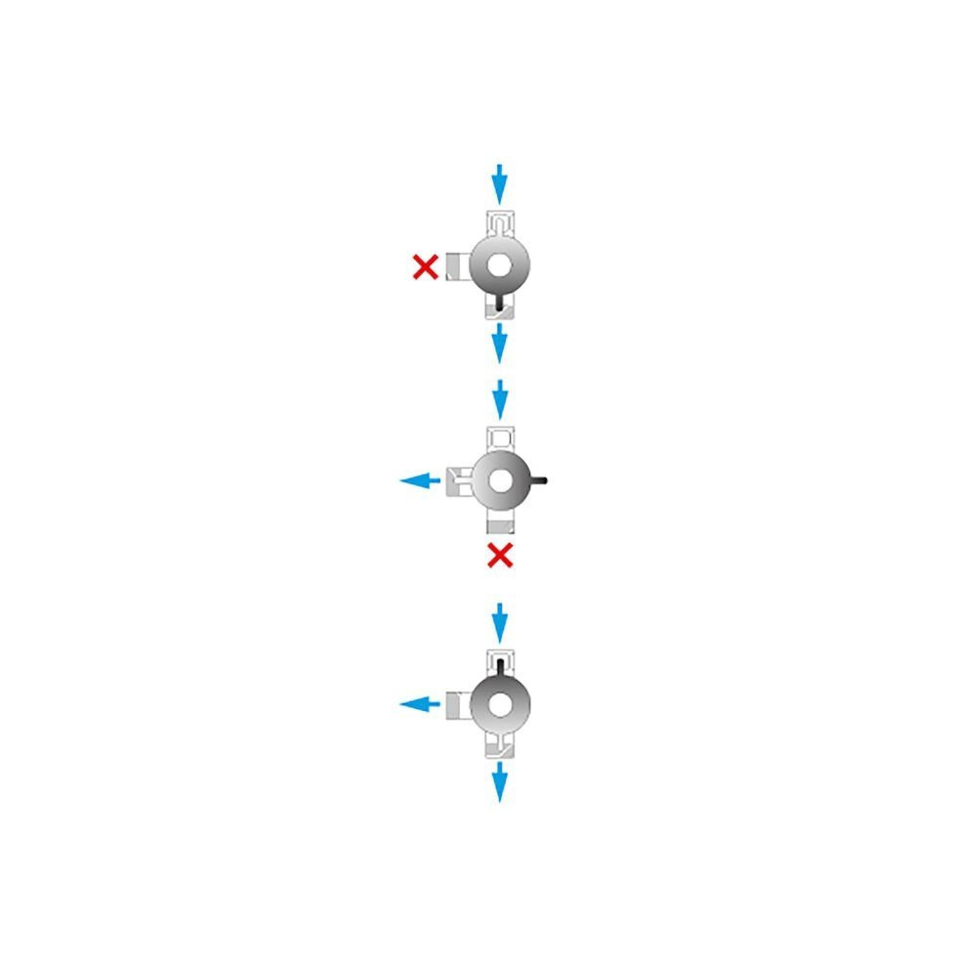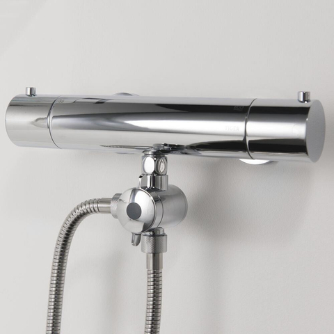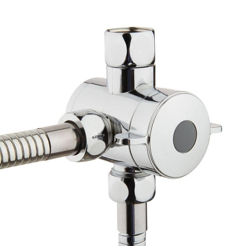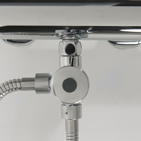 Op de chromen verdeler zit een ronde omstelknop waarmee je kunt kiezen naar welke douchekop het water moet lopen. Deze knop is ook met natte handen makkelijk te bedienen.