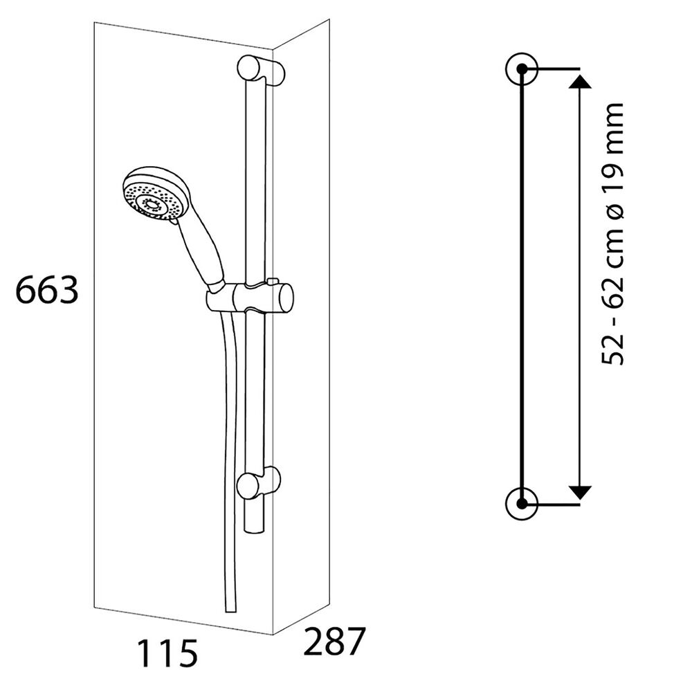 Deze ronde doucheset is uitgevoerd in de kleur chroom en bevat een handdouche, doucheslang en douchestang. De Valencia doucheset kan geplaatst worden op de plek van de oude doucheset, indien de ruimte tussen de twee steunen van de oude doucheset tussen de 52 cm en 62 cm breed is.