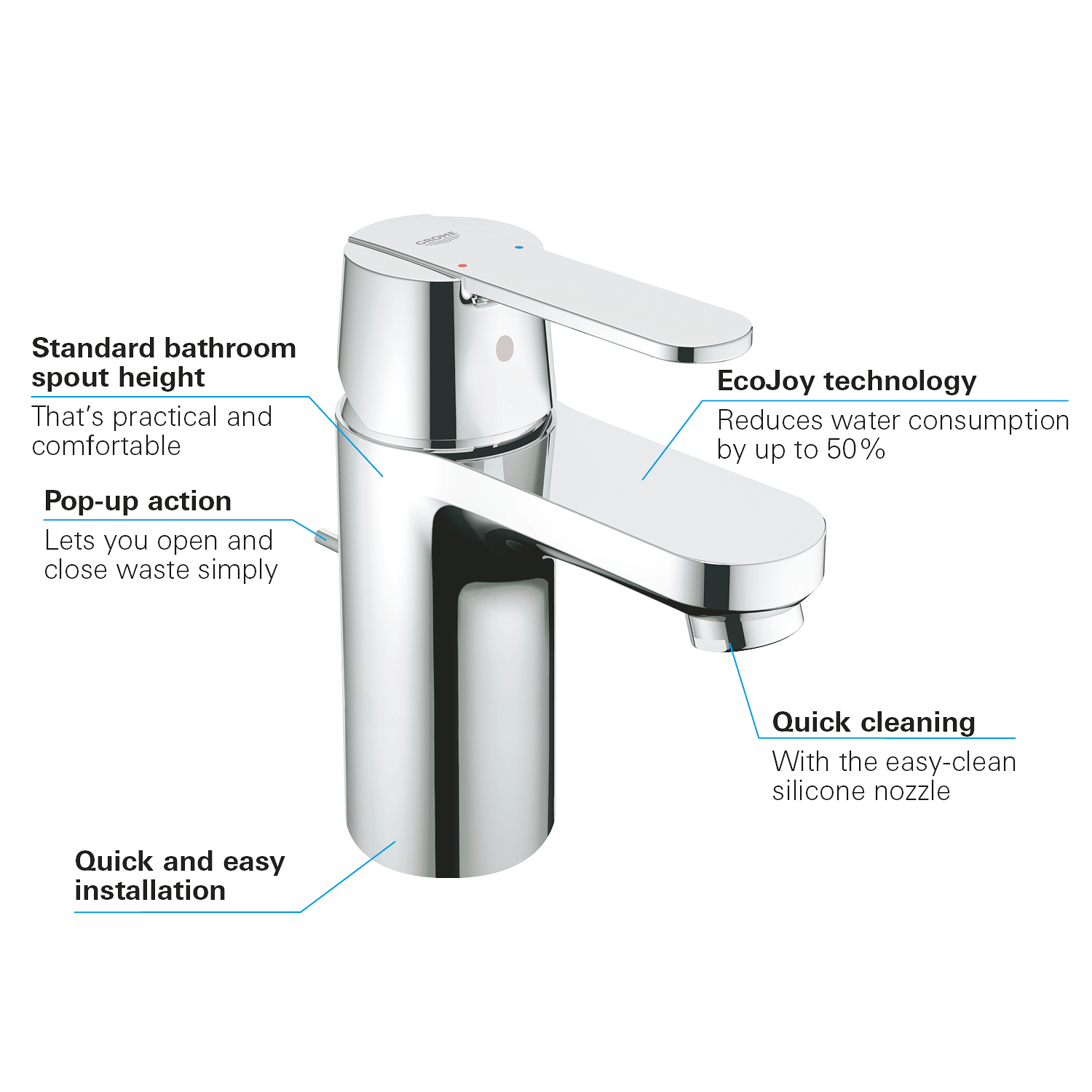 Stijl en functionaliteit voor een geweldige prijs – De GROHE Get eengreeps wastafelmengkraan! De vormgeving van de Get weerspiegelt de kernwaarden van het minimalisme en maakt dit moderne design toegankelijk voor een breed publiek. De kegelvormige overgang van het kraanhuis naar de greep zorgt voor een verfijnd design zonder concessies te doen aan de stevigheid. De solide greep verzekert je van een soepele en comfortabele bediening.