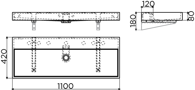 KraangatenDe wastafel heeft 7 voorbewerkte kraangaten zodat naar keuze 1-, 2- of 3-gats kranen gemonteerd kunnen worden maar ook twee kranen. In de meegeleverde handleiding wordt uitgelegd hoe je een kraangat dient door te boren. Je kan echter ook kiezen om een wandkraan met deze wastafel te combineren. Dit maakt dat de wastafel nog beter te reinigen is.