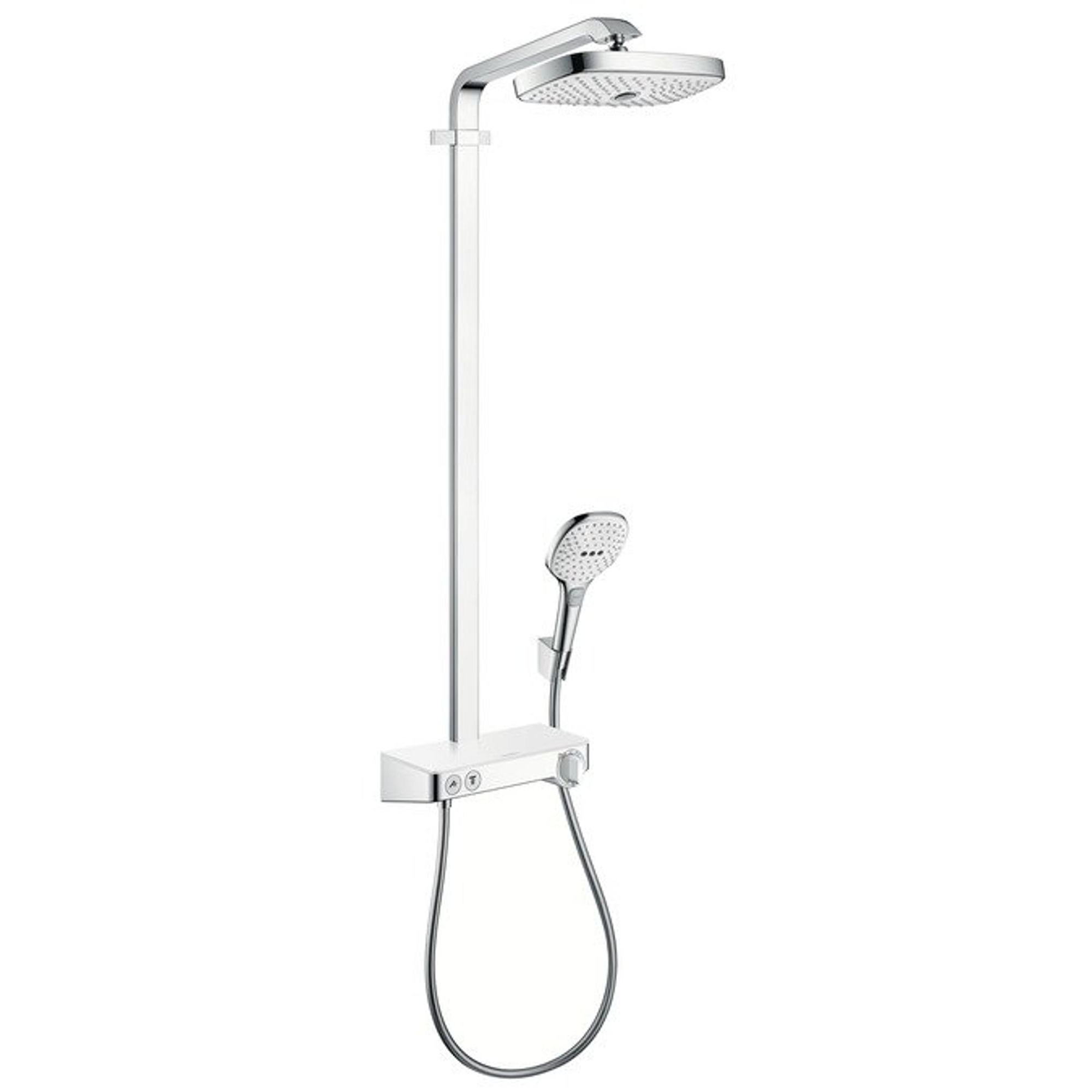 Hansgrohe Raindance Select E300 showerpipe: met Showertablet 300 opbouwkraan thermostatisch met handdouche 3jet en hoofddouche 2jet wit/chroom