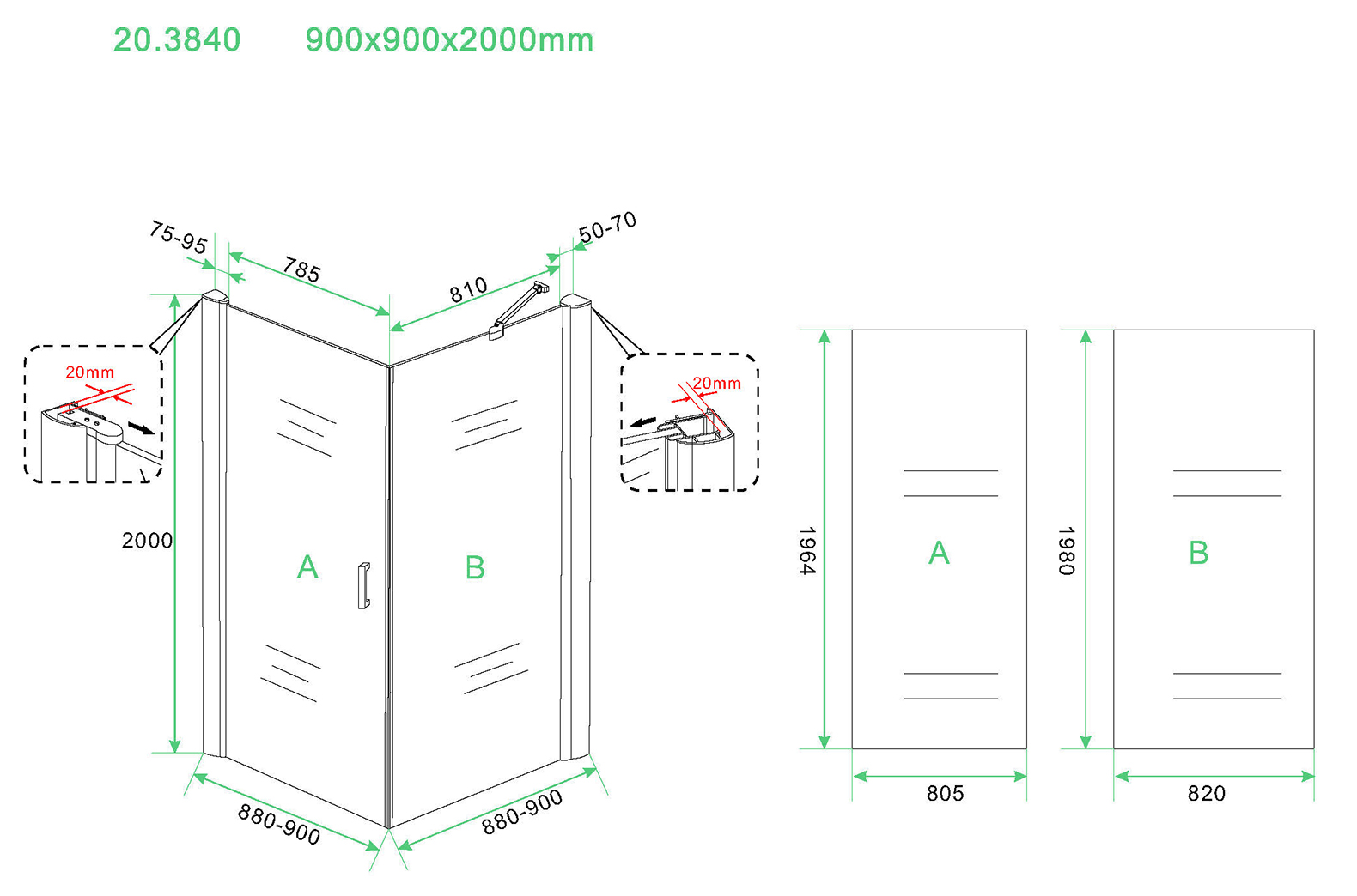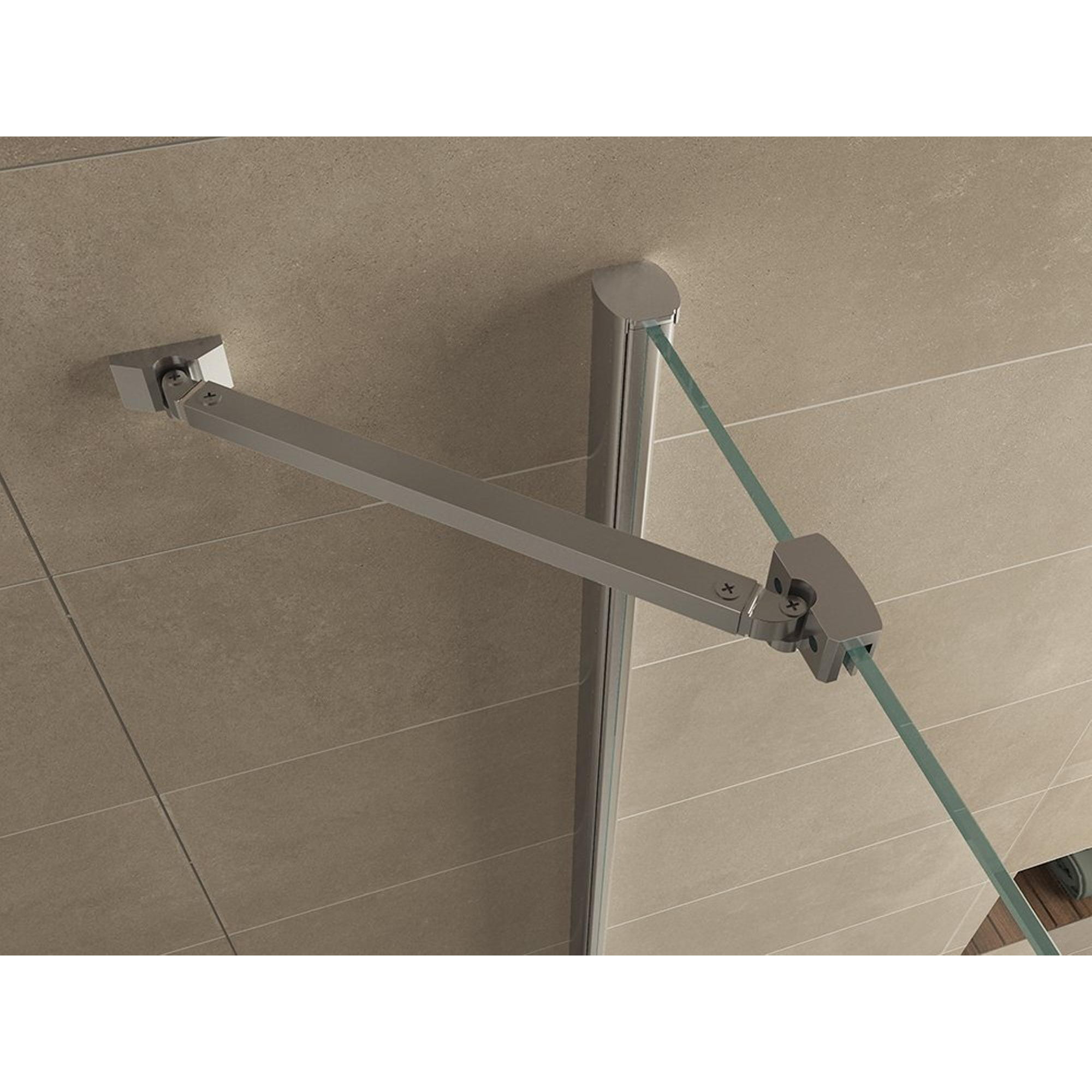 Deur 90cm, wand 90cm en 200cm hoog inclusief 2 chroom wand profielen welke 20mm aan beide zijden naar binnen verstelbaar zijn.