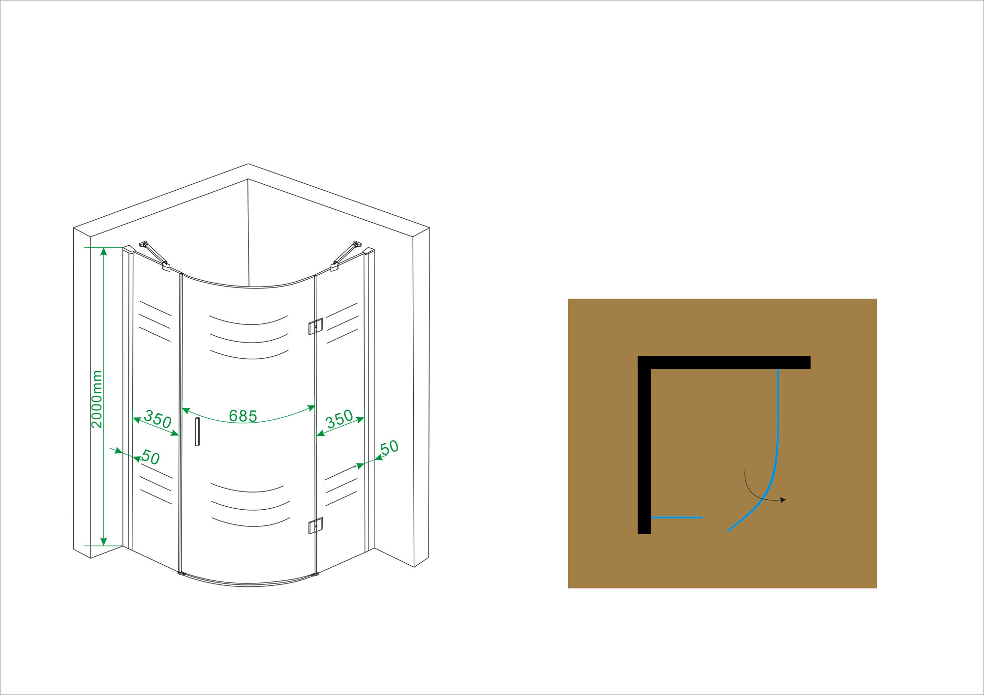 Rechts scharnierend en 200cm hoog inclusief 2 chroom wand profielen welke 20mm aan beide zijden verstelbaar zijn.