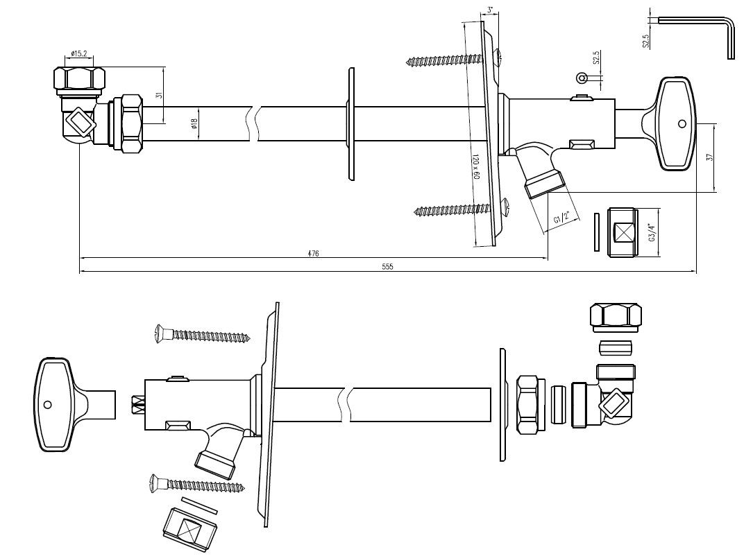 Duurzame Materialen en Extra AccessoiresGemaakt van roodkoperen buis met een diameter van 22 mm en voorzien van een knelknie 22x15, biedt deze kraancombinatie een langdurige weerstand tegen corrosie en slijtage. De kraan wordt ook geleverd met een losse bediensleutel, waardoor het gemakkelijk is om de watertoevoer te regelen zonder dat de kraan continu toegankelijk is voor onbevoegden.